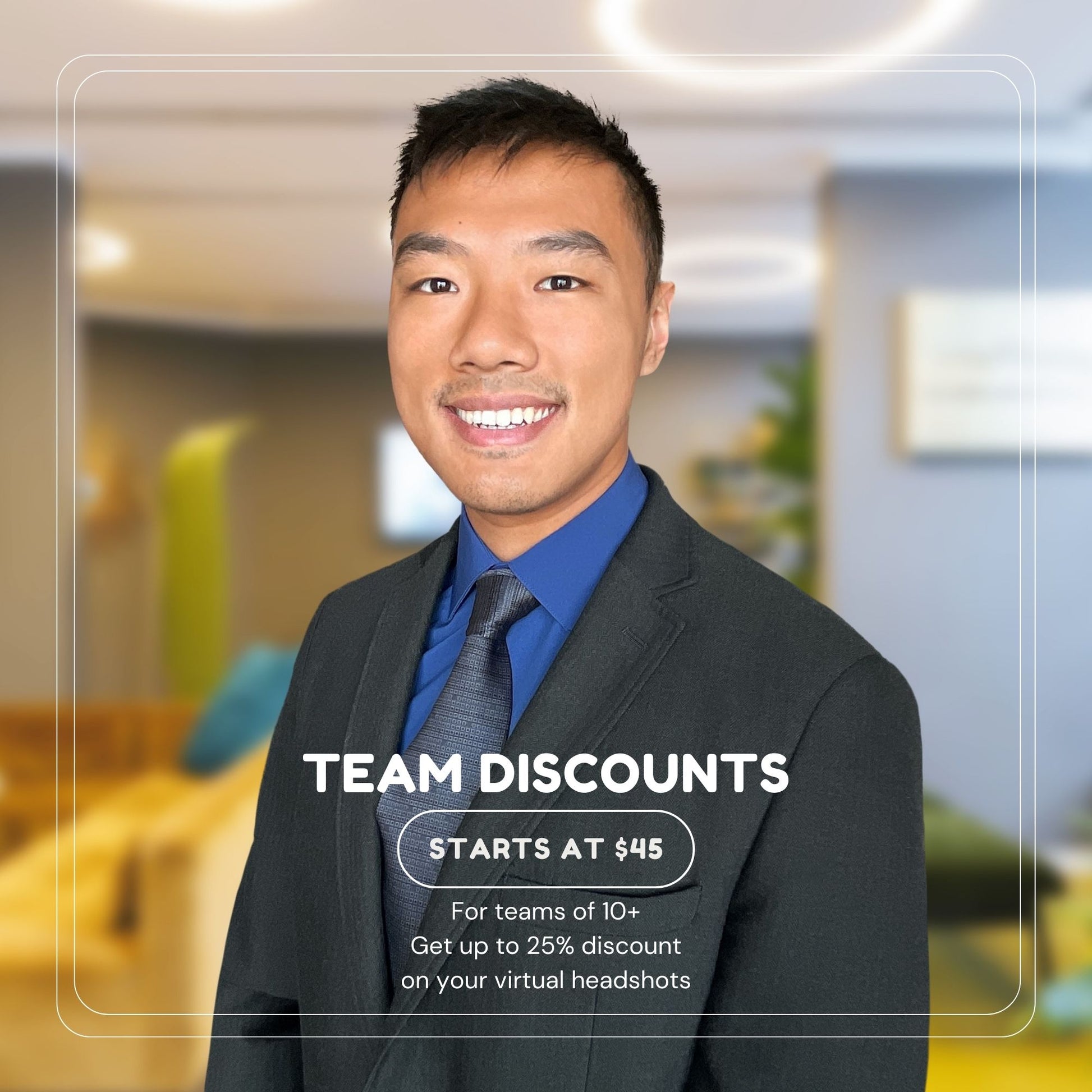 Use your TEAM DISCOUNT CODE on the checkout page while booking your Virtual Headshot.